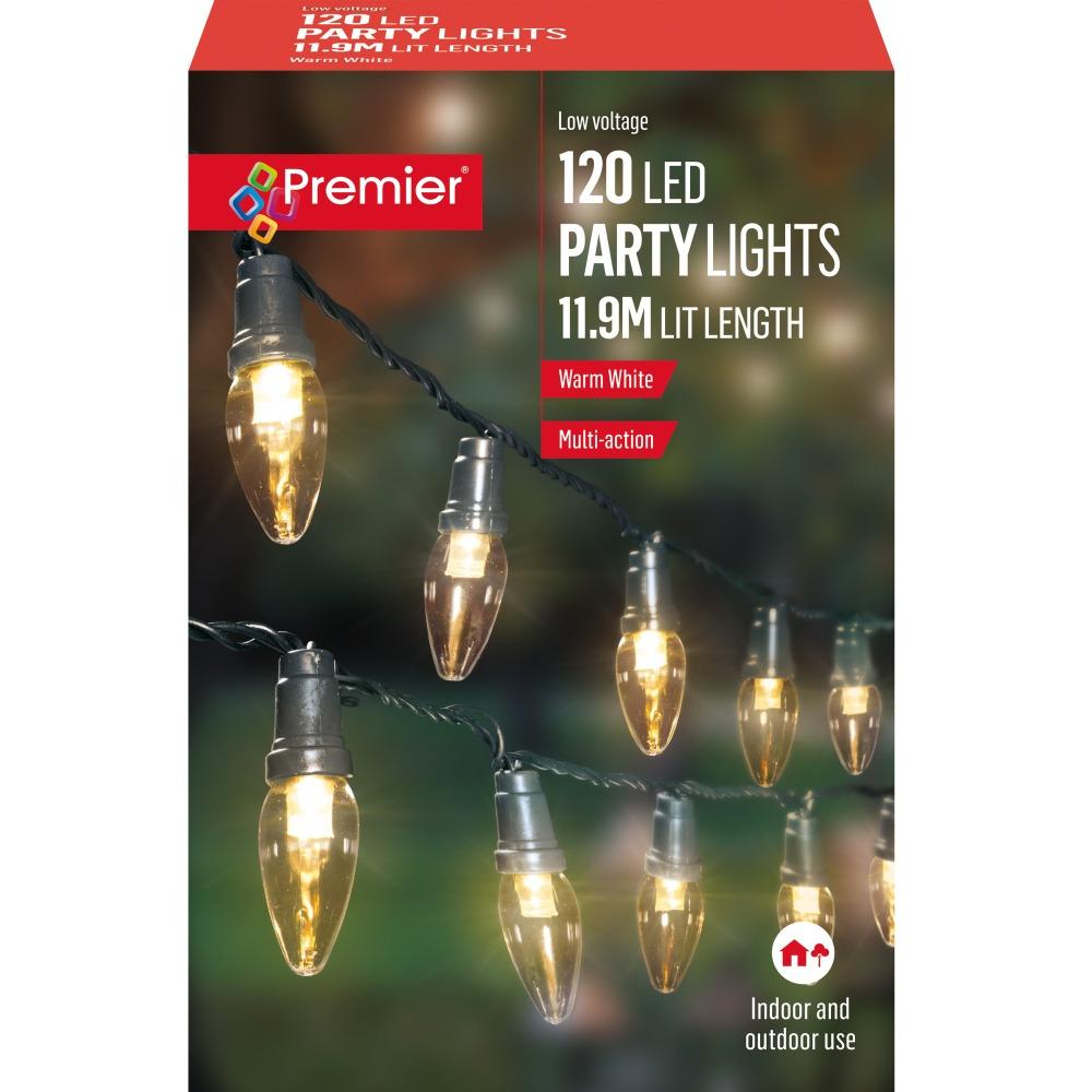 - Warm White LED party lights with 120 bulbs and 11.9m lit length.