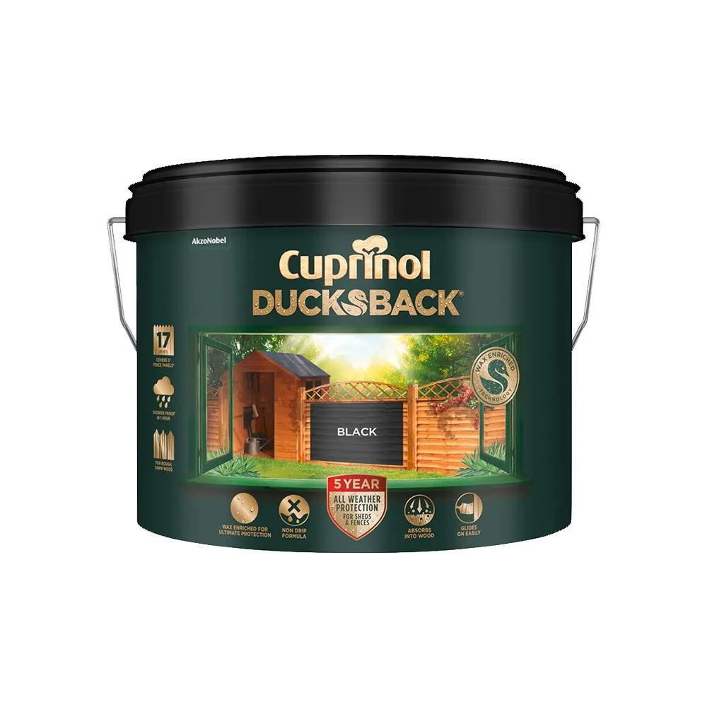 Cuprinol 5 year ducksback has an advanced, wax enriched and non-drip formulation, that colours and weatherproofs sheds and fences for up to 5 years.