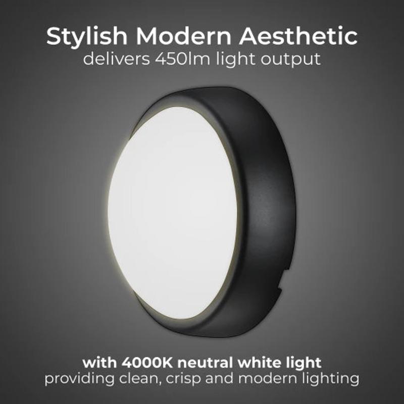 Compact round exterior LED bulkhead delivering 450 lumens of neutral white light (4000K) using just 5.5W. IP54 rated for outdoor residential use and supplied with white or black bezel options to suit your finish.