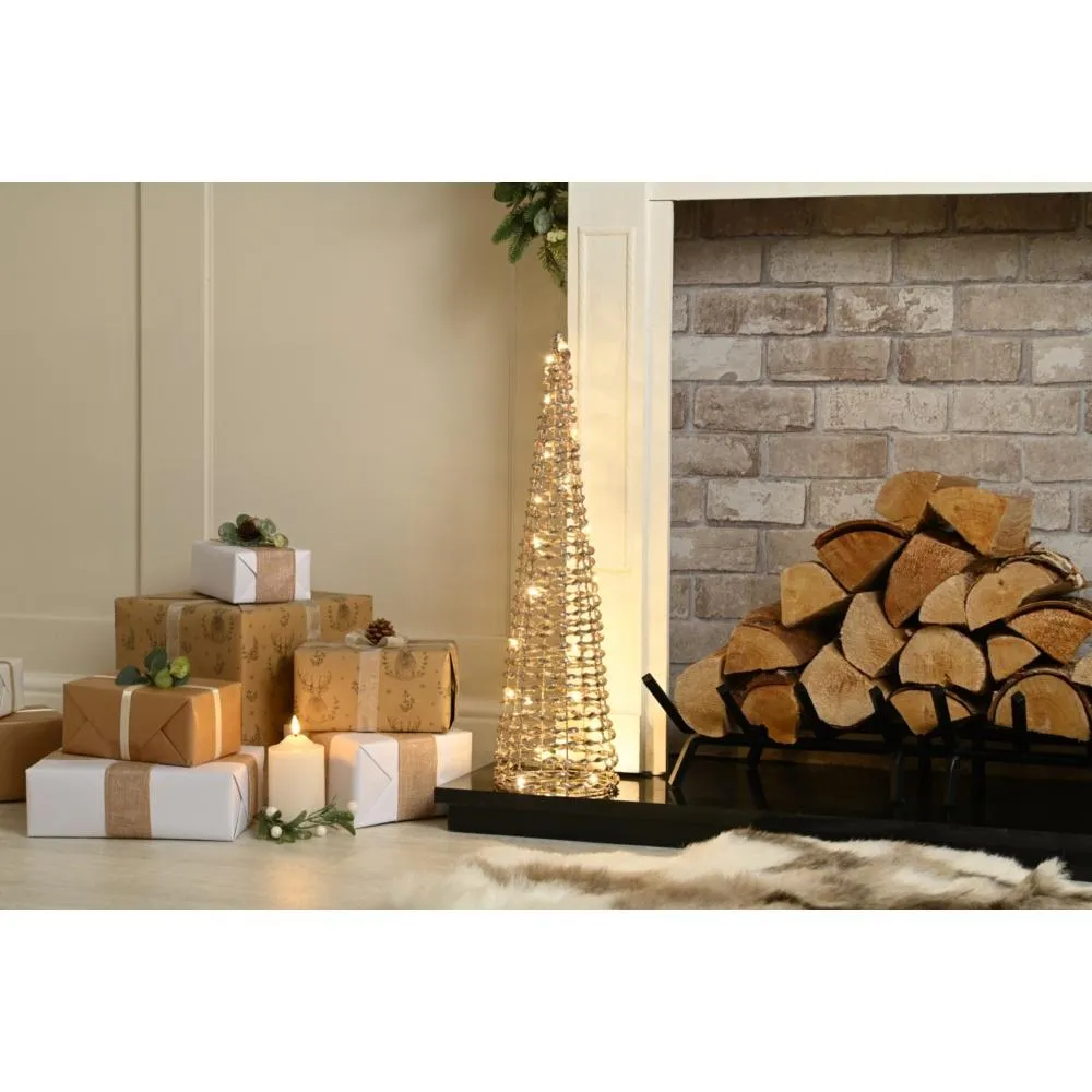 This led lit battery operated champagne gold cone tree - 60cm is ideal for enhancing your home this festive season. Fully illuminated with 30 warm white micro led lights this cone tree creates a soft glow that contrasts beautifully with the woven design.