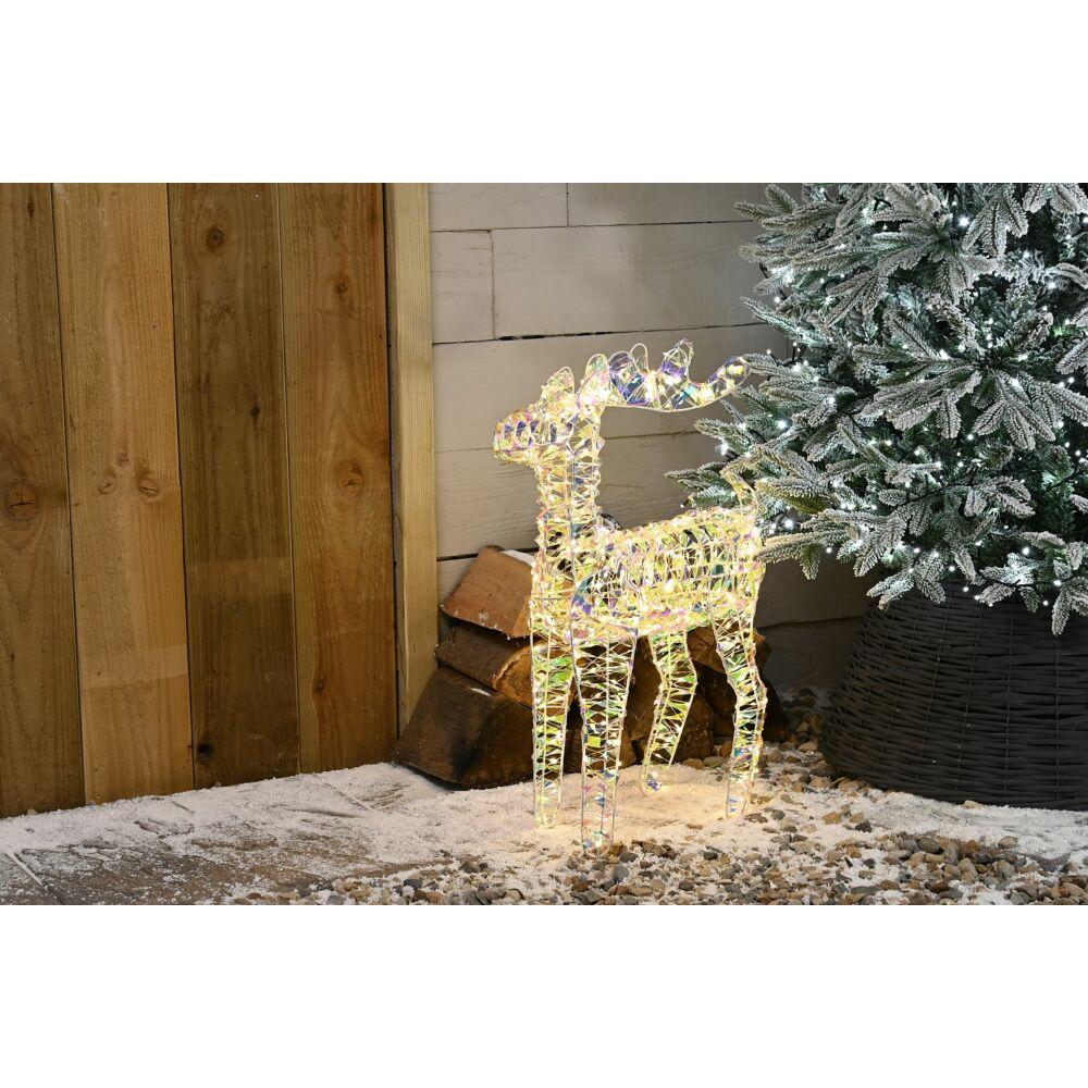 The Festive Lit Star Shimmer Reindeer - 60cm features a stunning lighting effect that will illuminate your home or garden. Standing at 600mm tall, it is lit with 720 warm white micro LEDs and includes an 8-setting multi-action controller. This reindeer is designed for durability and comes with an IP44 transformer and a 5000mm lead cable.