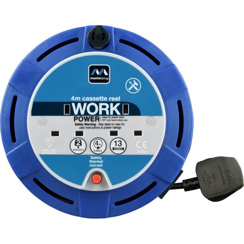 This Masterplug compact cassette reel is just perfect when you need a cable reel around the home. The sturdy yet light portable cable reel has a 4 metre cable with two sockets, enabling you to use for home or even in the garden.