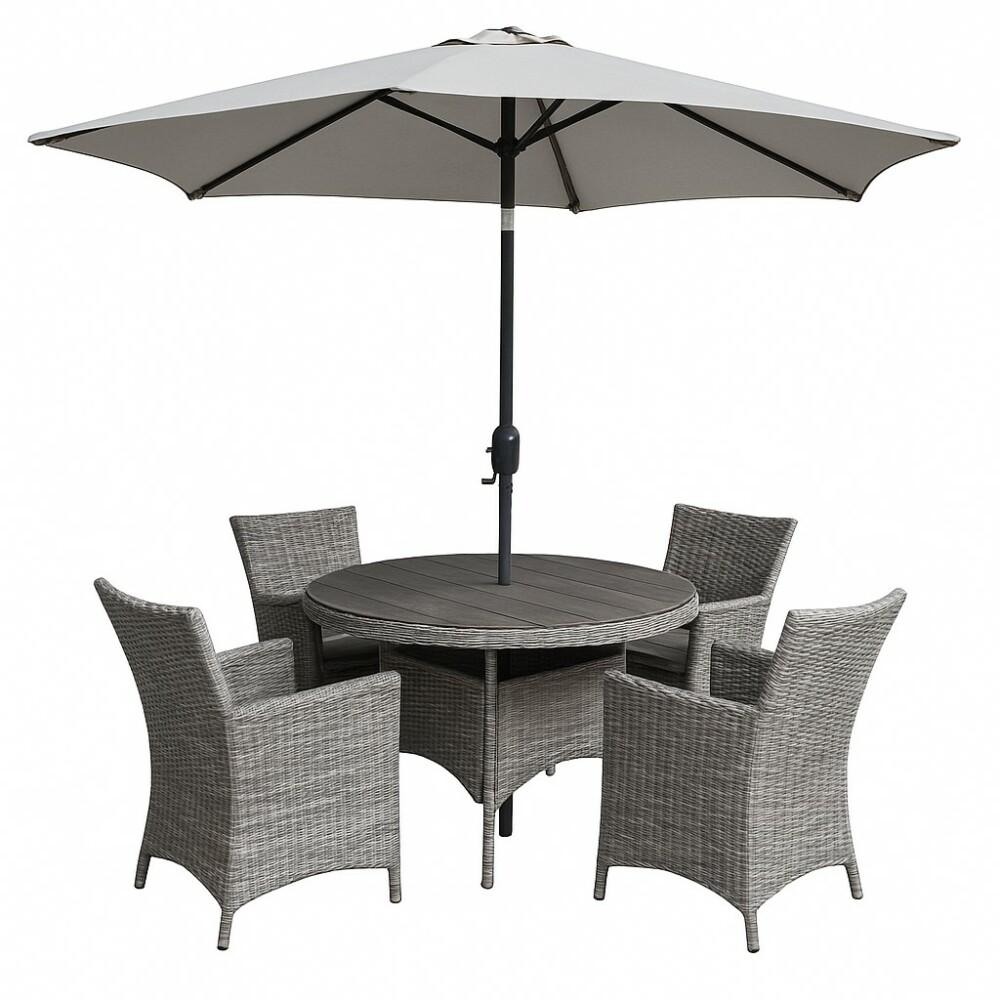 - A 4-seater round dining set in grey rattan featuring a polywood table top and 2.5m parasol.