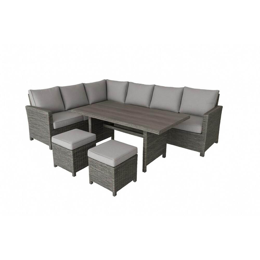 - A stylish 6-seater grey rattan corner dining set with plush cushions and an aluminium frame.