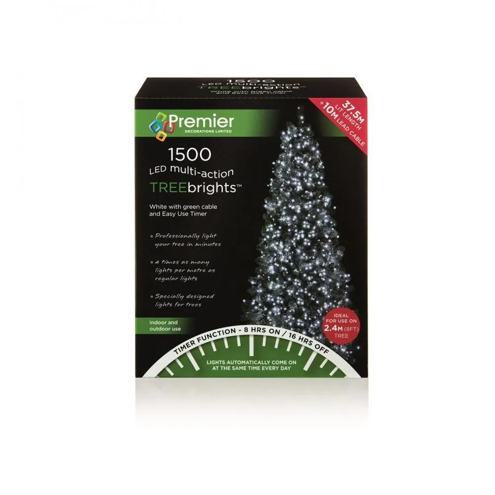 The premier 1500 led multi-action treebrights - white are superbright energy efficient led lights which can be used indoors and outdoors. They come with 5m of cable before the first bulb and 37.5m of lights.