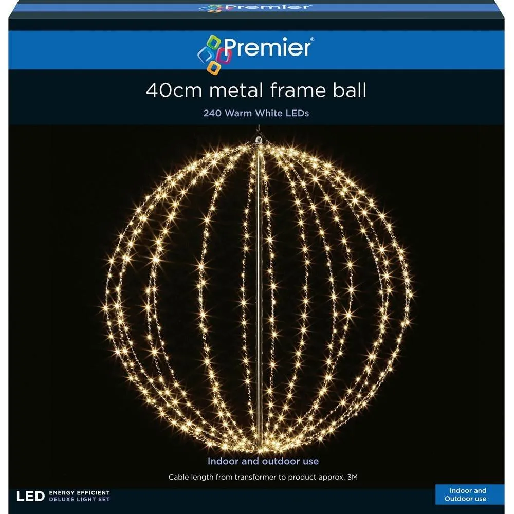 The premier led metal frame ball - 40cm is beautifully lit with 240 warm white leds and can be displayed indoors or outdoors either on a wall, from a celling or in a tree. Comes with a handy 3m lead cable