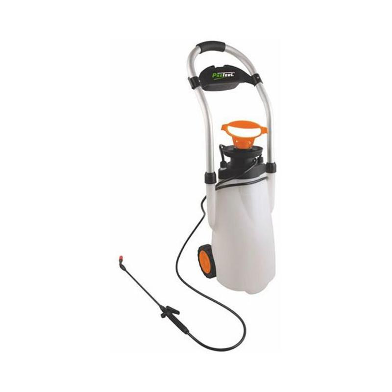 The ProTool Trolley Sprayer is a 12-litre wheeled trolley sprayer designed for efficient application of fertilizers, pesticides, and herbicides, featuring an adjustable nozzle and ergonomic handle for comfortable use.